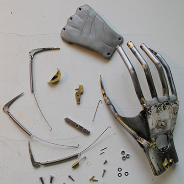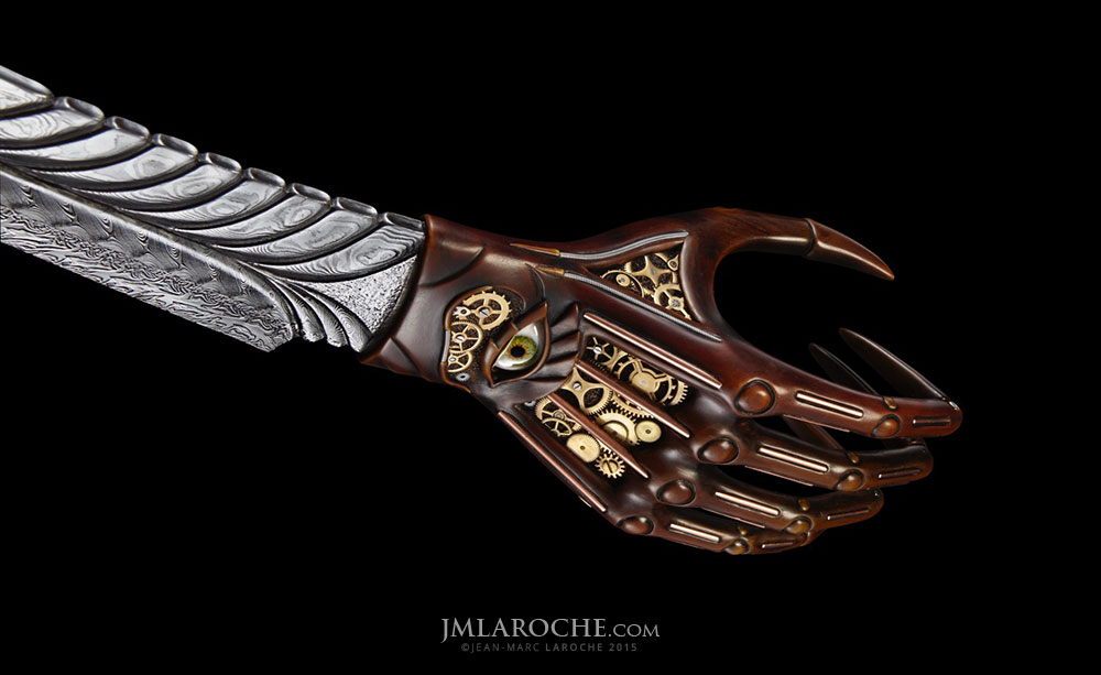 Le système mécanique en acier inox, est simple et fiable. L’original de cette main a été sculpté en résine époxy, la reproduction a été faite en fonte de bronze à la cire perdue. Enfin la lame en acier Damas a été forgée et façonnée par le grand coutelier suédois, Roger Bergh.